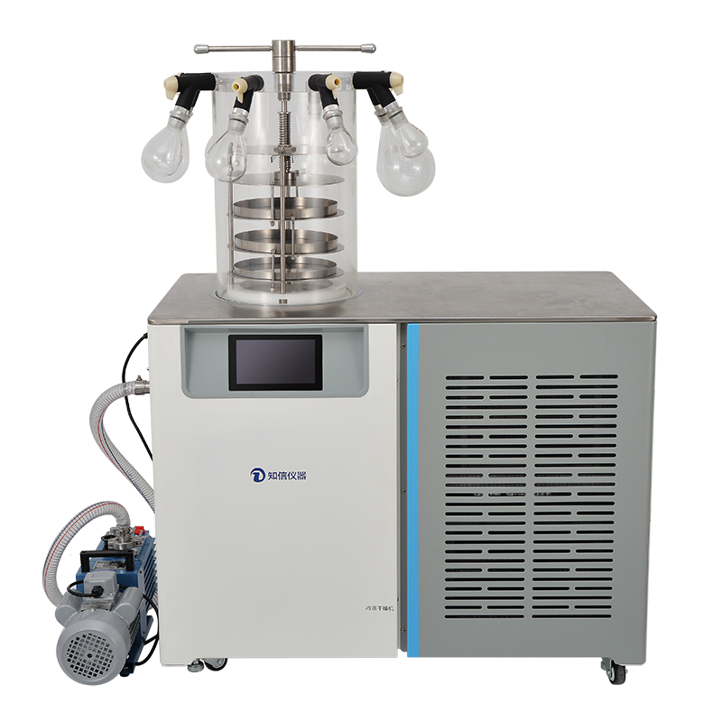 冷凍干燥機(jī)采用國際品牌思科普壓縮機(jī)制冷,制冷迅速,冷阱溫度低。采用7寸觸摸液晶屏控制系統(tǒng),操作簡單方便,功能強(qiáng)大,結(jié)構(gòu)緊湊,捕水能力強(qiáng)。樣品于東功能,無需低溫冰箱。此采用無色透明干燥室,采用亞克力材質(zhì),樣品清楚直觀。