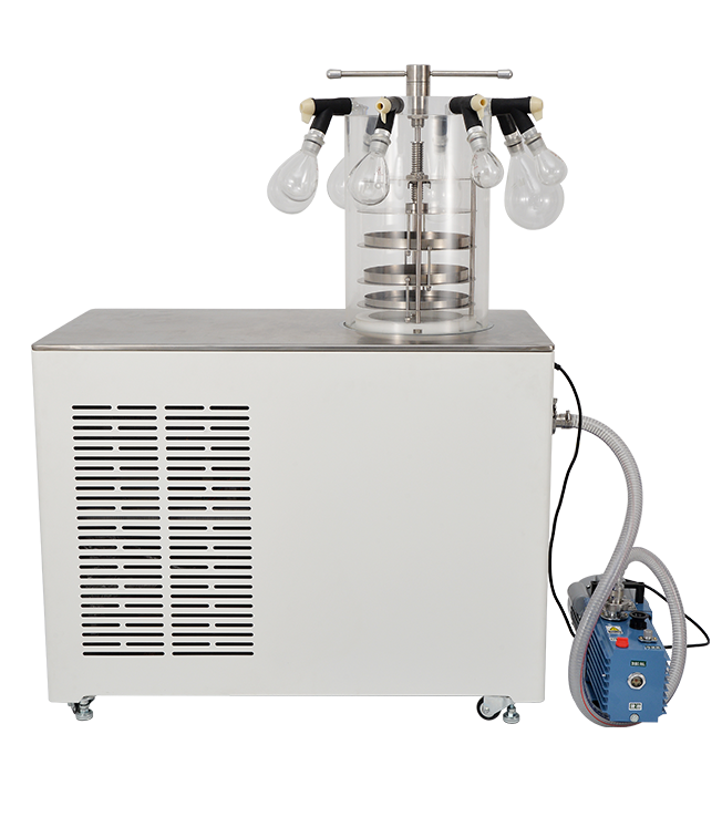 冷凍干燥機是將含水物品預(yù)先凍結(jié),然后使其水分在真空狀態(tài)下升華而獲得干燥物品的一種技術(shù)方法。經(jīng)冷凍干燥后物品理化性質(zhì)、生物特性基本不變,易于長期保存,復(fù)水后物品能迅速恢復(fù)到凍干前的形態(tài),并且能保持其原有的生化特性。因此,冷凍干燥機在化工、食品、醫(yī)藥、生物等制品的制備和檢測領(lǐng)域得到廣泛應(yīng)用。
