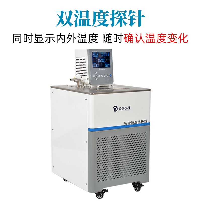 智能恒溫循環(huán)器 智能恒溫循環(huán)器又稱低溫浴槽,是自帶制冷和加熱的高精度恒溫源。它廣泛應(yīng)用于石油、化工、冶金、醫(yī)藥、生化、物性測(cè)試及化學(xué)分析、高等院校、工廠實(shí)驗(yàn)室及計(jì)量質(zhì)檢等研究部門。可在浴槽內(nèi)進(jìn)行恒溫實(shí)驗(yàn),亦可通過(guò)軟管與其他設(shè)備相連,作為恒溫源配套使用,如旋轉(zhuǎn)蒸發(fā)器、電泳儀、粘度計(jì)、醫(yī)用冷帽、降溫毯等,或用于給其它設(shè)備進(jìn)行循環(huán)冷卻,如電鏡、分子泵、離子泵、擴(kuò)散泵、微波治療機(jī)等。